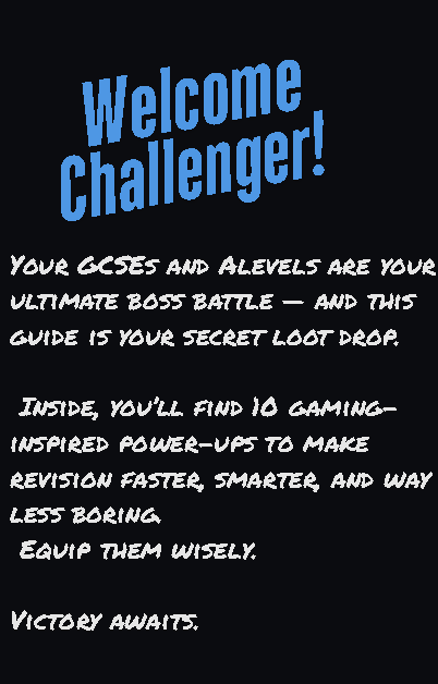 An exclusive gaming-themed study guide with 10 powerful revision strategies, boss battle tips, and printable quest sheets to help you crush your GCSEs like a final boss.